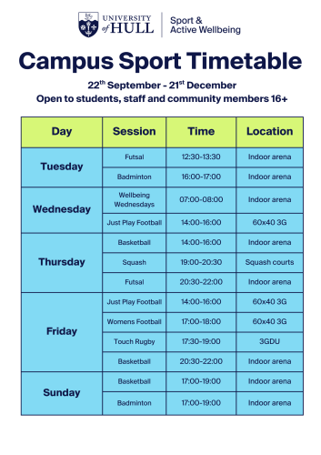Campus Sport is our weekly turn up and play programme which takes place at the Allam Sport Centre. This programme will start on the 22nd September and run until 21st December. This programme is open to all students, staff and community members who are 16+. It is a great way to meet new friends, play the sports you love and be active whilst you are here at University. All of our sessions are priced at £2.50 except from; Womens Football, Touch Rugby and Wellbeing Wednesdays which are all FREE of charge. However from 22nd – 28th September all sessions will be FREE for the first week. You can view the latest programme below;